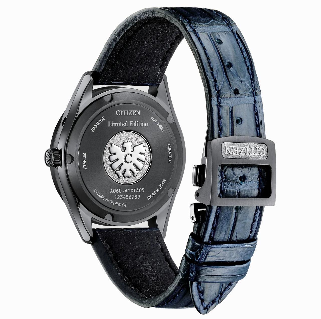 Blue color. Applied polished steel tone markers. Murakumo dyed Washi paper that emulates clouds. Eagle mark at the bottom, symbolizing the twin ideals of The CITIZEN – foresight and dedication to the pursuit of ideals, as well as the enduring connection between watch and wearer.