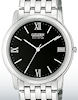 Citizen Stiletto Eco-drive watch AR0010-53E. Round stainless steel case with bracelet, black dial, sapphire crystal.