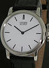 Citizen Stiletto Eco-drive ultra-slim watch. Polished round slim stainless steel case, black leather band, white dial.