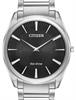 Citizen Stiletto Eco-drive watch AR3070-55E. Round ultra-slim stainless steel case with bracelet. Black Sunburst Guilloche dial with luminous markers, sapphire crystal.