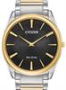 Citizen Stiletto Eco-drive watch AR3074-54E. Round ultra-slim stainless steel case with bracelet and gold plated accents. Black Sunburst Guilloche dial with luminous markers, sapphire crystal.