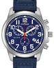 Citizen Eco-Drive 100 meters water resistant watch powered by quartz chronograph movement. Satin finished stainless steel case. Blue dial with large Arabic markers. Blue nylon strap