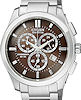 Citizen Eco-Drive watch powered by quartz chronograph movement. stainless steel case and bracelet. Brown dial with large luminous markers and date calendar.