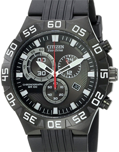 Citizen Eco-Drive 100 meters water resistant watch powered by quartz chronograph movement. Black IP plated stainless steel case with black rubber band. Black dial with date and 24-hours hand.