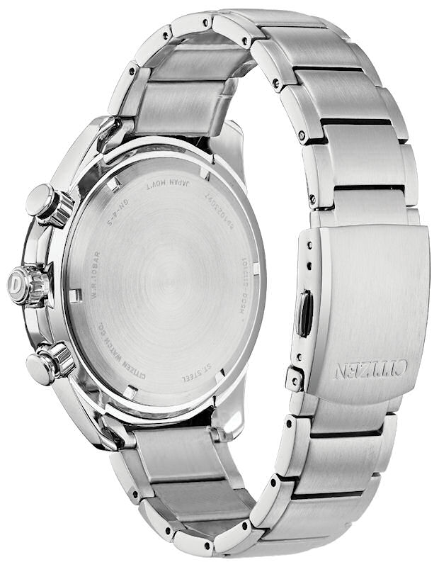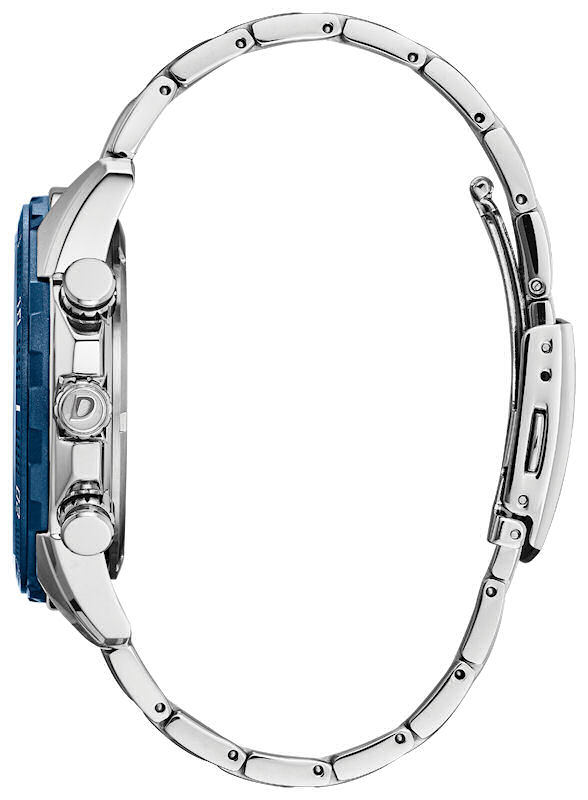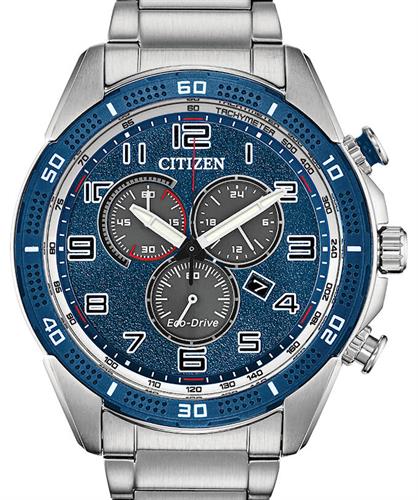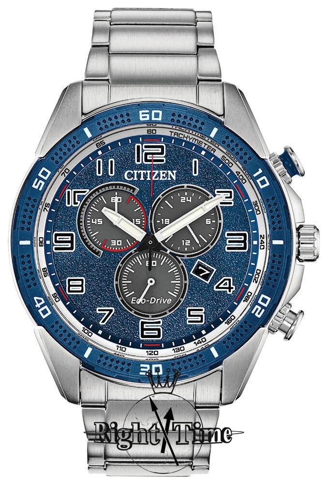 Citizen watch model AT2440-51L powered by Eco-Drive chronograph movement. Stainless steel case and bracelet. Blue color dial with date calendar and 24-hours sub-dial. Water resistant to 100 meters