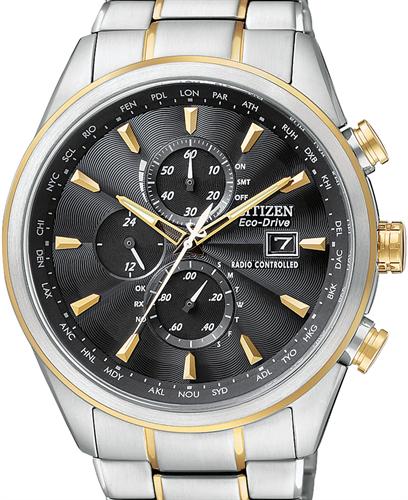 Citizen Eco-Drive Radio-Controlled Chronograph World Timer. Automatic time in 26 world cities, radio-controlled accuracy in 5 zones, perpetual calendar, 12/24 hour time, date. Stainless steel case with gold plated accents and sapphire crystal. Black dial. Steel bracelet with gold plated accents. Water resistant to 200 meters.