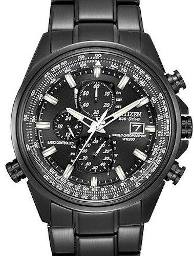 Citizen Eco-Drive Radio-Controlled Chronograph World Timer. Automatic time in 26 world cities, radio-controlled accuracy in 5 zones, perpetual calendar, 12/24 hour time, date. Black plated stainless steel case with sapphire crystal. Black dial with silver tone hands and markers. Black steel bracelet. Water resistant to 200 meters.