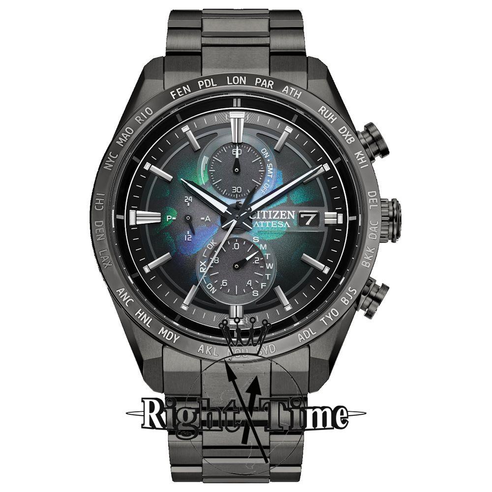 Citizen Attesa model AT8286-65E. Eco-drive solar powered movement with radio controlled atomic timekeeping. Black DLC super titanium case and bracelet. Anti-glare treated sapphire crystal. Terra-inspired dial with touches of greens, purples, and blues. Water resistant to 100 meters.