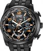Citizen Eco-Drive Radio-Controlled World Timer. Limited Edition. Automatic time in 26 world cities, perpetual calendar, 12/24 hour time, day/date. Stainless steel black PVD plated case and bracelet with sapphire crystal. Black dial with orange color accents. Water resistant to 200 meters.