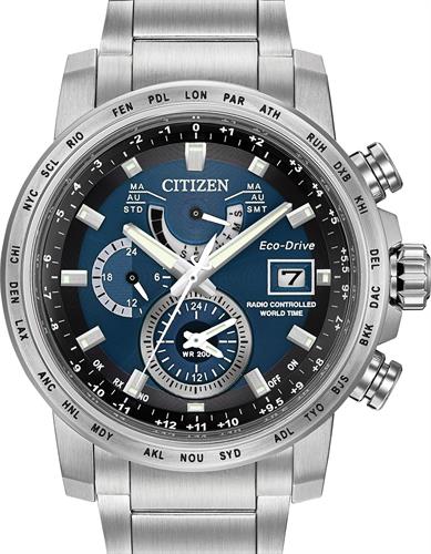 Citizen Eco-Drive Radio-Controlled World Timer. Automatic time in 26 world cities, perpetual calendar, 12/24 hour time, day/date. Stainless steel case with sapphire crystal and bracelet. Blue dial. Water resistant to 200 meters.