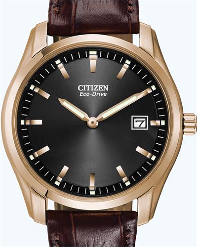 Citizen Eco-Drive wrist watch with CITIZEN Rechargeable by light Eco-Drive Quartz movement. Black dial with date calendar, and luminous hands and markers. Stainless steel gold plated case, brown leather band.