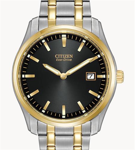 Citizen Corso Eco-Drive wrist watch model AU1044-58E with CITIZEN Rechargeable by light Eco-Drive Quartz movement. Black dial with date calendar, and luminous hands and markers. Stainless steel case and bracelet with gold plated accents