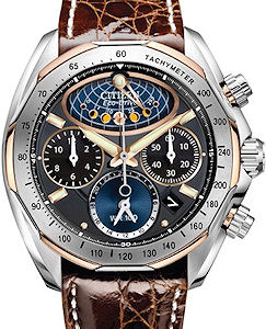 Citizen Signature Moonphase Flyback Chronograph collection featuring this stainless steel with gold plate accents watch. This watch features Citizens` Eco-Drive technology. No more batteries! Gray dial with countersunk blue and black colored sub-dials. Combination finished with highly polished and satin accents. Large sized 44mm case. Brown leather band