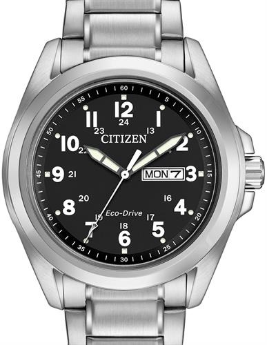 Citizen Eco-Drive watch model AW0050-82E. Stainless steel case and bracelet. Black color dial with day/date.