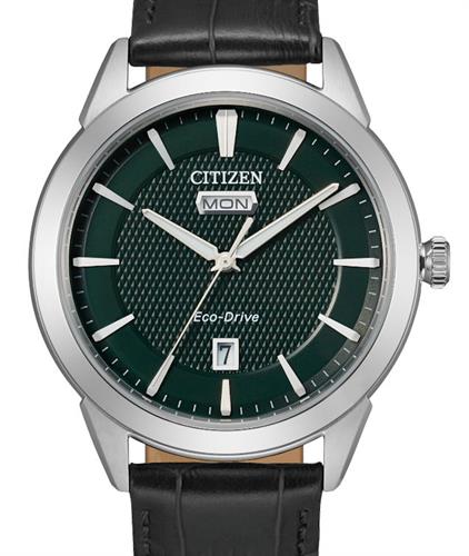 Citizen Eco-Drive watch model AW0090-02X. Stainless steel case with leather band. Green color dial with day/date.