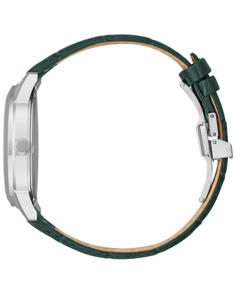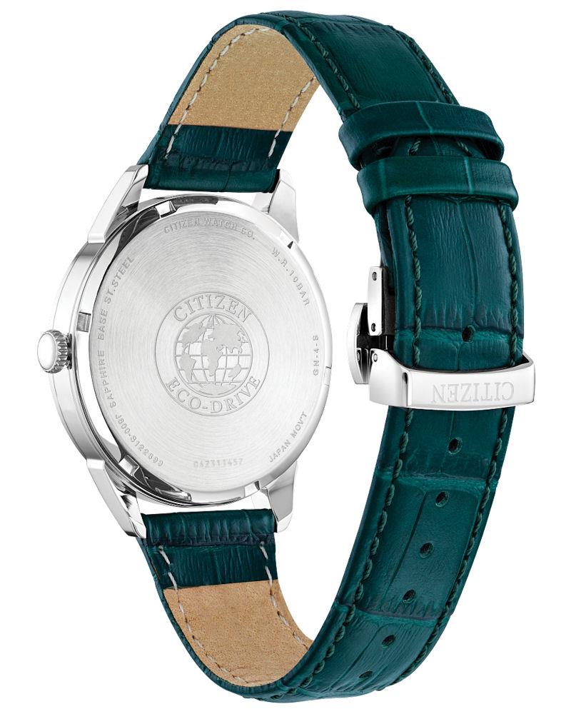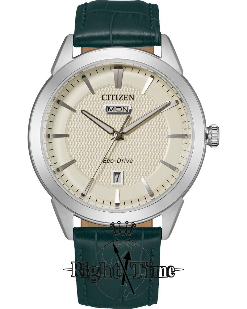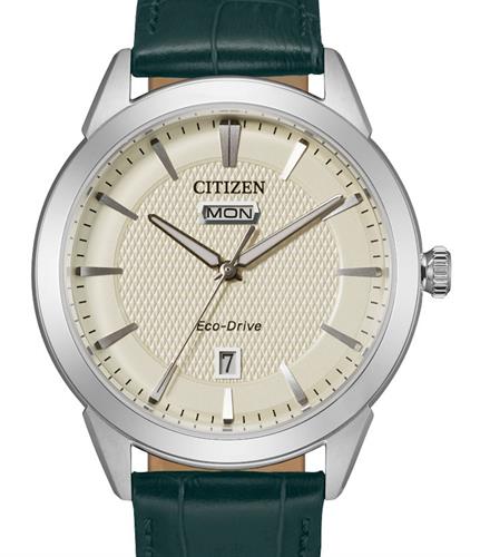 Citizen Eco-Drive watch model AW0090-11Z. Stainless steel case with green leather band. Ivory color dial with day/date.