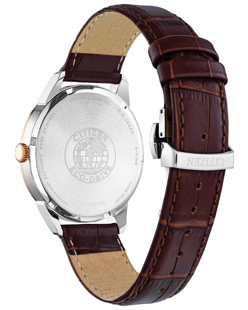 Citizen Eco-Drive watch model AW0096-06L. Stainless steel case with rose gold plated bezel, brown leather band. Blue color dial with day/date.