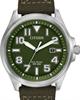 Citizen watch powered by Eco-Drive movement. Stainless steel case with military green nylon strap. Green color dial with date and large luminous hands and markers. 200 meters water resistant