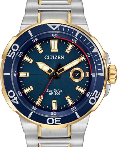 Citizen Endeavor watch model AW1424-54L powered by Eco-Drive movement. Stainless steel case and bracelet with gold tone accents. Blue color dial with date and large luminous hands and markers. 200 meters water resistant