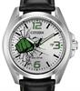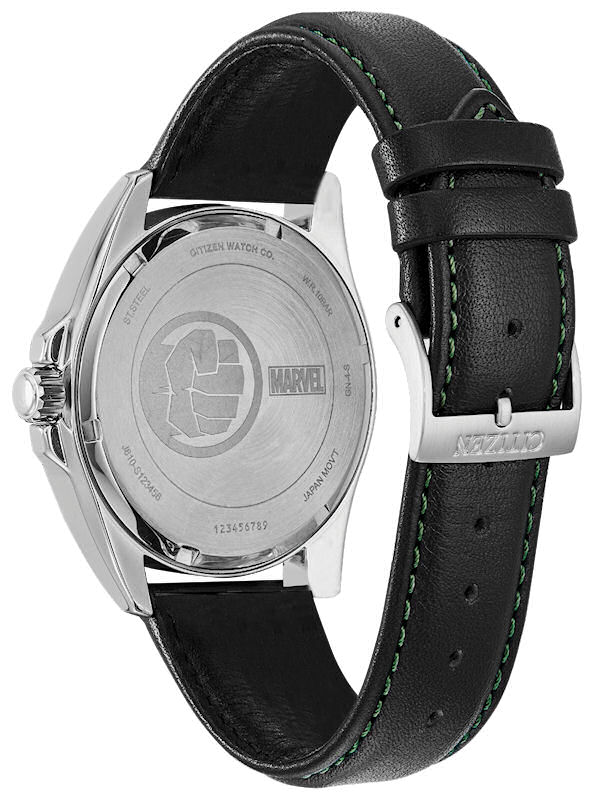 Citizen Marvel Hulk watch model AW1431-24W. Powered by Eco-drive quartz movement with date. Stainless steel case with black leather strap. Silver color dial with green accents and famous Hulk Smash.