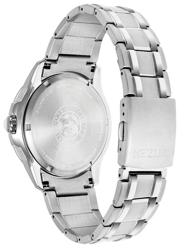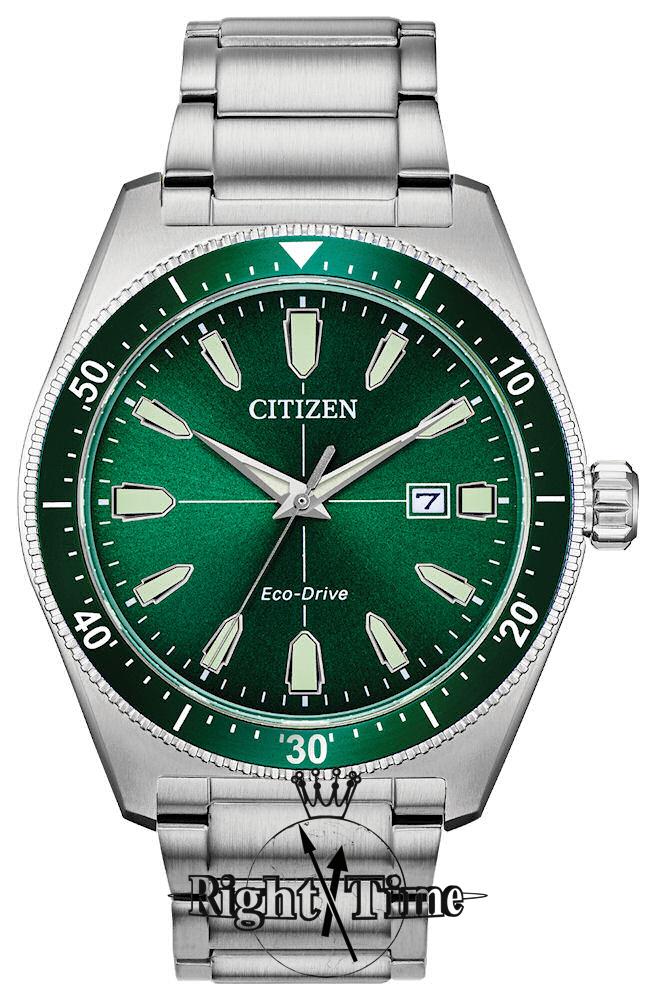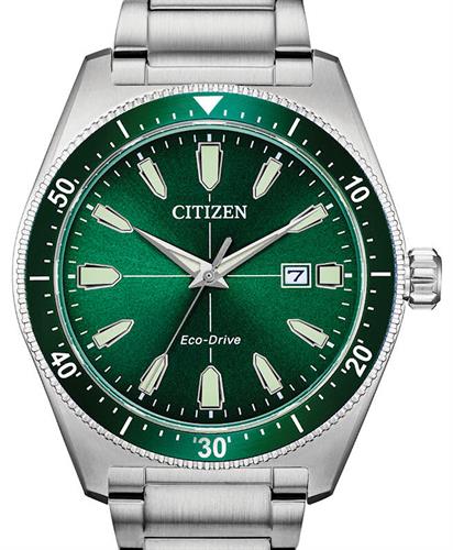 Citizen watch model AW1598-70X powered by Eco-Drive movement. Stainless steel case and bracelet. Green color dial with date calendar. Water resistant to 100 meters.