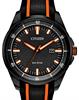 Black color. Luminous hour markers/dots. Orange color accents.