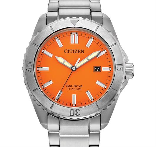 Citizen Brycen Eco-Drive watch model AW1840-50X. Titanium case and bracelet. Orange color dial with date.