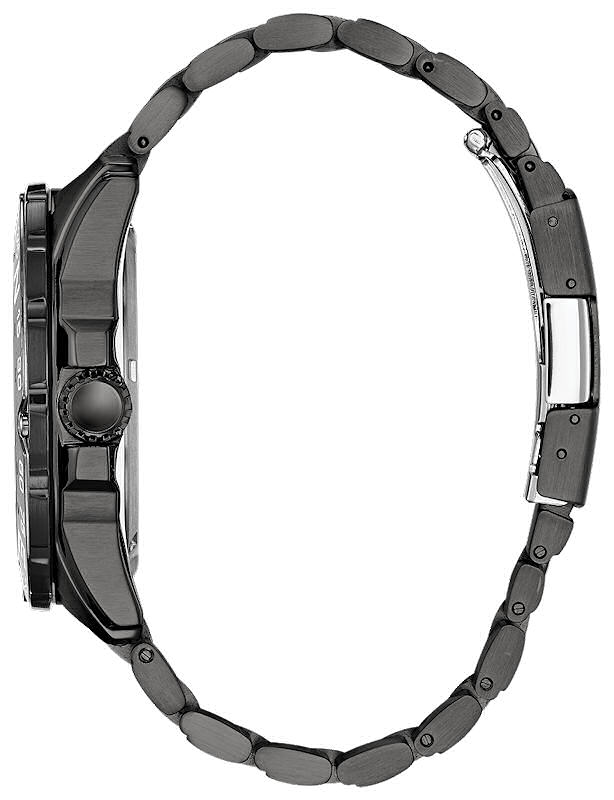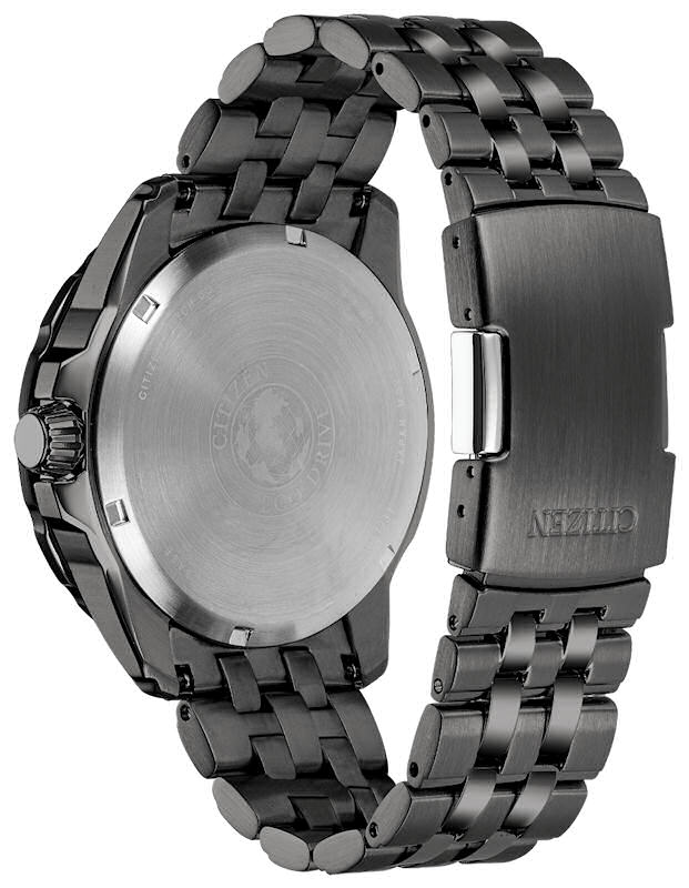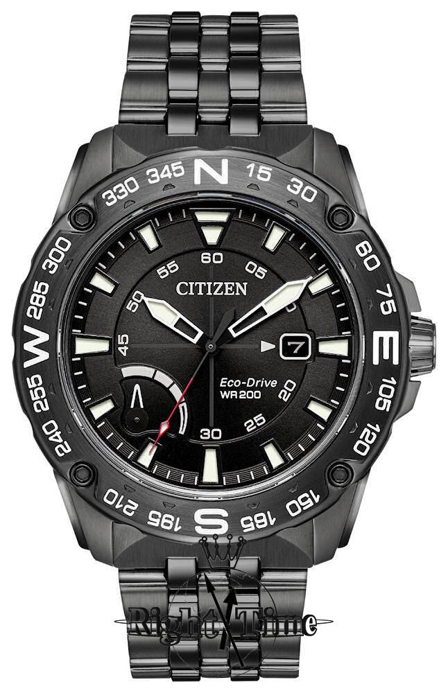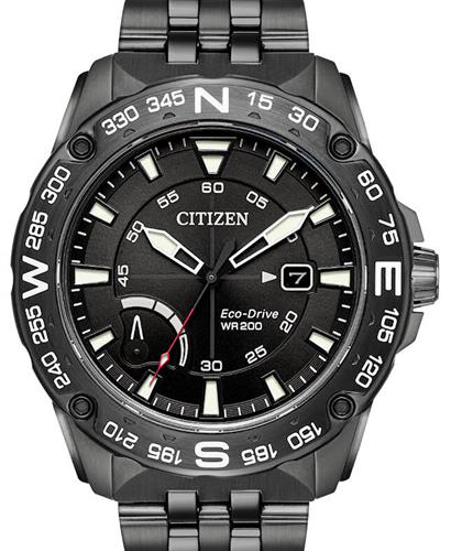 Citizen PRT model AW7047-54H. Solar powered Eco-Drive. Stainless steel case with black PVD coating. Black dial with power reserve indicator. Black rotating bezel with compass ring. Black PVD plated stainless steel bracelet.