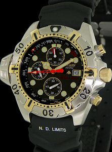 Citizen BJ2004-08E Aqualand Eco-Drive wrist watch with CITIZEN Rechargeable by light Eco-Drive Quartz chronograph movement. Underwater Depth Display up to 125 feet. Sandblasted finish solid 316L Stainless steel case with gold plated accents on uni-directional 0-60 bezel, screw-down crown, black color dial with luminous 5 minute markers and date calendar. 200m water resistance. Rubber watch band with No Decompression (N.D.) Limits table printed on "6" part