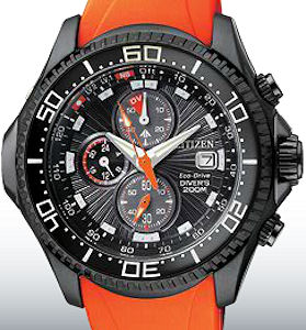 Citizen Promaster Diver BJ2118-09E powered by Citizen Eco-drive movement. Black plated Steel case, black 0-60 bezel, black dial with luminous markers. Orange rubber band. Water resistant to 200 meters. Watch functions:Depth Display to 125 Feet; Maximum Depth Memory; 50-minutes chronograph; 12/24 Hour Time.