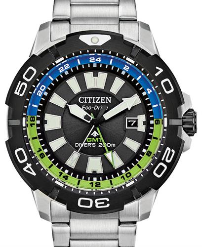 Citizen Promaster GMT Diver watch model BJ7128-59G powered by Citizen Eco-drive movement. Steel case, black 0-60 bezel, black dial with luminous markers and blue/green outer 0-24 ring. Steel bracelet. Water resistant to 200 meters. Anti-shock and anti-magnetic