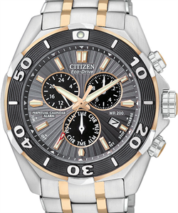 Citizen Signature Perpetual Calendar Chronograph watch. 200 meters water resistant. 43mm steel case with bracelet and gold plated accents. Sapphire crystal. Grey color dial and 0-60 bezel. Watch functions: perpetual calendar, alarm, chronograph, 24-hours time, second time zone.