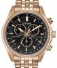 Citizen Brycen Eco-Drive Chronograph watch. Model BL5563-58E. Black dial, rose gold plated stainless steel case and bracelet. Watch features: 1/20 second chronograph up to 60 minutes, 12/24 hour time, perpetual calendar, dual time, tachymeter, date and alarm.