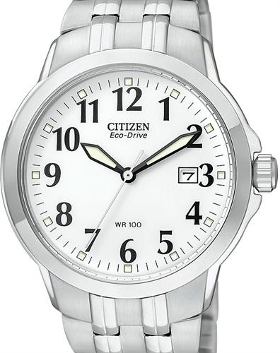 Citizen Eco-Drive 100 meters water resistant watch powered by Eco-Drive movement. Stainless steel case and bracelet. White color dial with large numerals.
