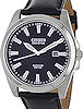 Citizen Eco-Drive 100 meters water resistant watch powered by Eco-Drive movement. Stainless steel case. Sapphire crystal. Black color dial. Black leather band
