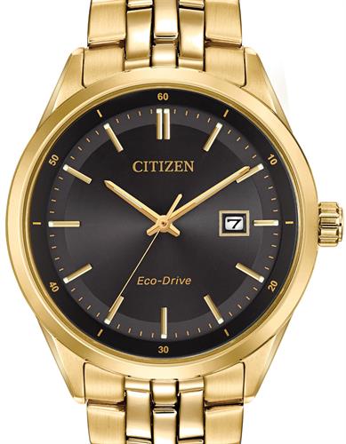 Citizen Sapphire Collection. Men`s Eco-Drive watch model BM7252-51E with a black dial, date calendar, gold plated stainless steel case and bracelet, sapphire crystal. Water Resistant 100 meters
