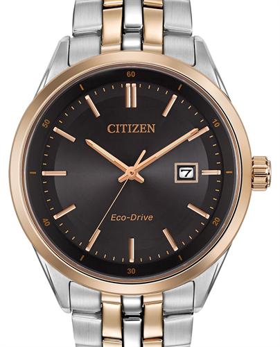 Citizen Eco-Drive powered by Eco-Drive movement. Steel case and bracelet with rose gold accents. Sapphire crystal. Brown color dial with date calendar and rose gold tone markers.
