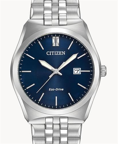 Citizen Corso watch model BM7330-59L powered by Eco-Drive movement. Steel case and bracelet. Blue color dial with date calendar and silver tone markers.