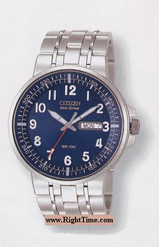CITIZEN Eco-Drive Japanese Quartz Analog ( Rechargable by light ). Day/Date calendar, window display. 180-Day Power Reserve.