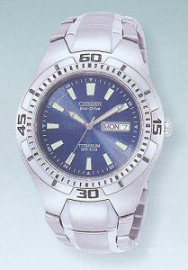 Citizen Eco-drive sport style watch model BM8280-50L. Satin finished titanium case and watch bracelet, polished bezel, blue dial with day/date calendar, luminous hands and markers. Water resistant to 100m.