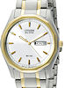 Citizen Eco-Drive 100 meters water resistant watch. Stainless steel case and bracelet with gold plated accents. White dial with day/date calendar.