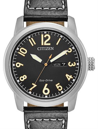Citizen Chandler Eco-Drive 100 meters water resistant watch powered by Eco-Drive movement. Stainless steel case. Black color dial with Arabic markers. Black leather strap