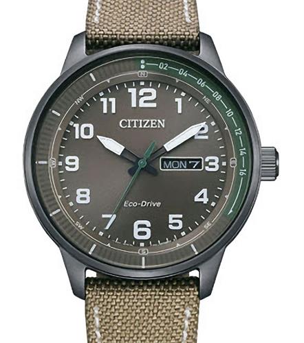 Citizen Eco-Drive watch model BM8595-08H. Grey plated stainless steel case with beige nylon strap. Grey dial Arabic luminous markers and hands, with day/date calendar.
