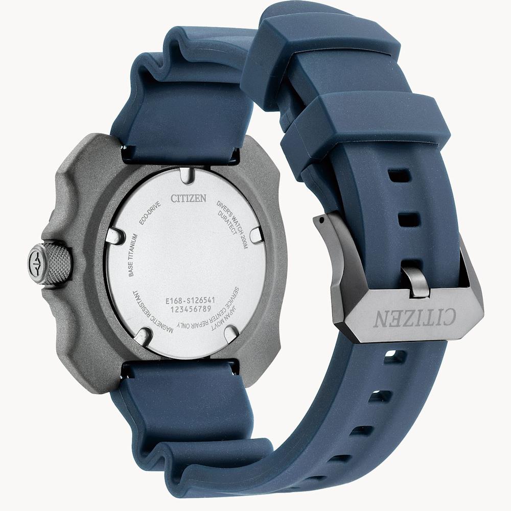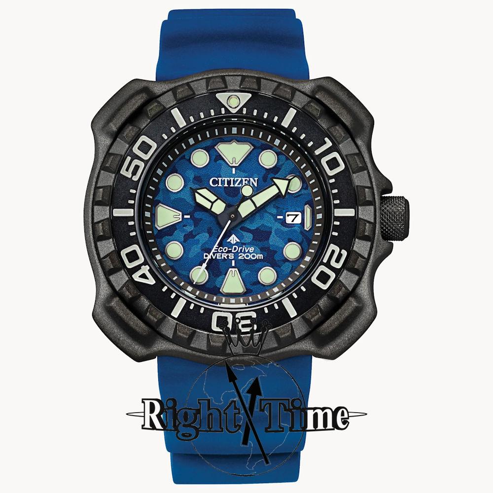 Citizen Promaster Dive BN0227-09L powered by Citizen Eco-drive movement. Super Titanium case with grey Duratect DLC coating, blue dial with camo print, date calendar and luminous markers. Blue rubber band. Water resistant to 200 meters