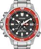 Citizen Promaster Diver Aqualand model BN2039-59E. Powered by light. Features: helium valve, depth meter, power reserve indicator, ISO compliant diver. Comes in stainless steel case with bracelet, black dial, and red 0-60 rotating bezel. Water resistant to 200 meters
