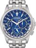 Citizen Men`s Eco-Drive Calendrier watch model BU2021-51L. Stainless steel case and bracelet. Blue dial with day and date sub-dials, 12/24 hour time, world time in 24 time zones. Water Resistant 100 meters