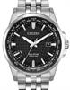 Citizen Eco-Drive watch model BX1000-57E. Features world time in 26 time zones, perpetual calendar and date. Stainless steel case with bracelet. Black "globe" textured dial.