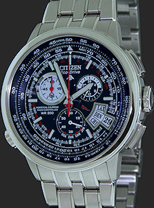 Citizen Chrono-Time AT pilot travelling companion, powered by light and set by the atomic signals from all over the world. Sliding E6b ruler inner bezel. 200m water resistant. Perpetual calendar and stopwatch. Blue dial