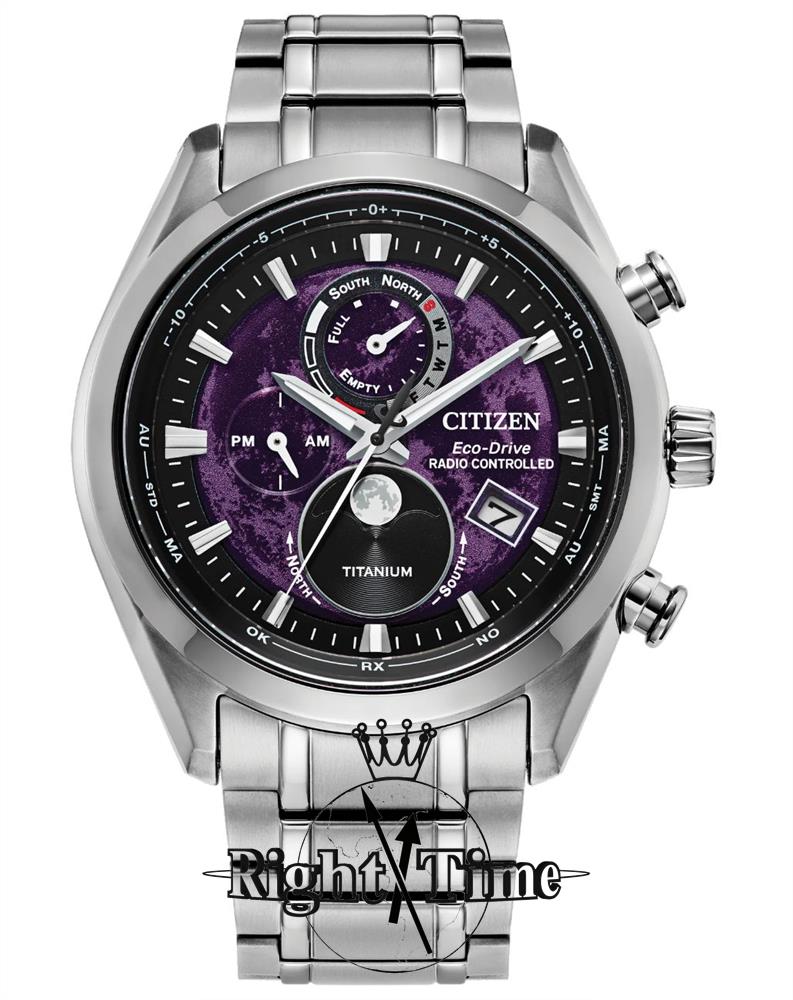 Citizen Lunar dial moon phase Tsuki-Yomi model BY1010-81Z. Ultra lightweight super titanium case and bracelet are 40% lighter and 5 times stronger than stainless steel. Sapphire scratch resistant crystal. The dial features a purple moon in the center with sub-dials recording day/date, am/pm, and the phase of the moon. Water resistant to 100 meters. Eco-drive solar powered with radio controlled timekeeping.