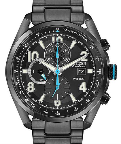 Citizen Men`s Eco-Drive Chronograph watch. Black plated stainless steel case with bracelet. Black color dial. Quartz chronograph movement with date and 24-hour hand. 100 meters water resistant.